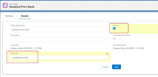 b) Navigate to Standard Price Book record and update ExternalId = standardpricebook and Active=true